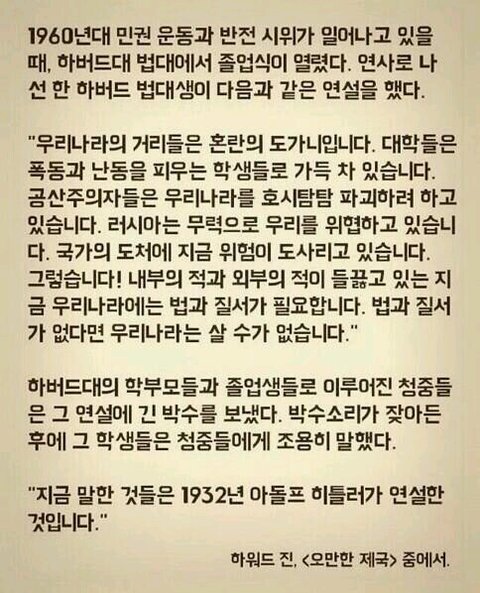 소름 돋네 히틀러에 대한건 항상 소름 돋음 히틀러가 나쁜놈이여도 세상에 몇 없는 엄청난 리더임에는 틀림 없음 그 리더쉽은 배울건 배워야함 히틀러의 행동이나 말, 연설 등을 똑같이 따라해 실험을 하면 매번 사람들은 홀라당 다 넘어감 저 반전 연설도 마찬가지고...인간의 심리를 교묘하게 이용하는것도 있지만 그 타고난 리더쉽을 좋은쪽으로만 사용했어도 영웅이였을텐데
