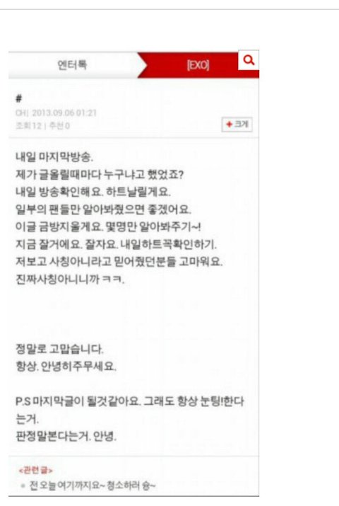 솔직히 처음에는 안믿었는데 혹시 모르니까 어제 새벽에 멘붕와서 이거 진짜냐고 글을 올렸는데 진짜라도 찬열이가아니라 종대 첸의 CH라고 .. 만약에 이게 진짜면 종대오빠가 안봤으면 좋겠어요 ..