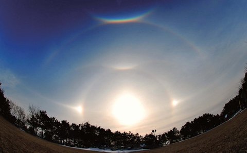 지난 1월 27일 오전 9시 30분에서 10시 30분 사이 무안만민교회 단물터(전남 무안군 해제면 천장리 산 153번지) 상공에 원형무지개를 비롯하여 희한한 형태의 각종 무지개가 복합적으로 나타났다(촬영 김새렘 Nikon D80, Fisheye 10.5mm, 1/500, f/11, ISO 200, 20110127_093433).
