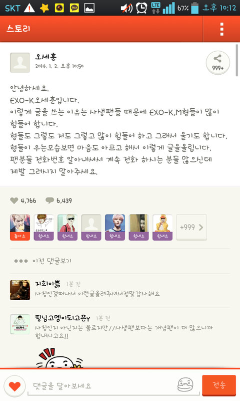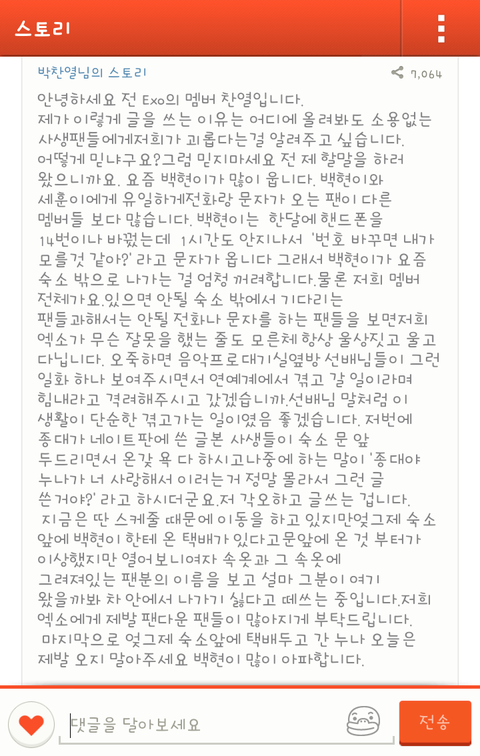 아 이런거 완전싫어 요즘엔 무슨 카스에엑소랑카톡해서 글쓰던데;; 개오글;; 알아서엑소이미지깍아내리고있어; 진짜 답없다 어린것들 저런거써서 사람들이 공유하고 댓글다니까 뿌듯하겟지 커서얼마나쪽팔릴까...