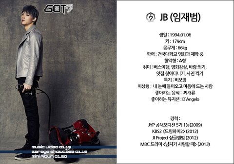 JB Say : 안녕하세요. JB입니다. 본명은 임재범이라고 하구요. 팀에서 리더와 보컬을 맡고 있고, 보너스로 시크한 이미지를 맡고 있습니다.^^ JYP에는 2009년에 공채 오디션을 통하여 1등!! 으로 들어와서 [드림하이 2]를 통해서 다른 친구들보다 먼저 보여졌고 JJ project라는 이름으로 앨범을 내는 등 총 4년간 열심히 준비했습니다. 부족한 점이 있다면 서로 잘 이끌어주고 도와주고 챙겨주면서 끝까지 윈윈하는 팀, 또 항상 가족같이 함께 잘 지내는 팀이 되었으면 좋겠습니다! 저희 GOT7 예!의!주!시! 부탁드립니다!