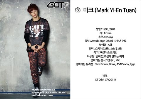 마크 Say : 안녕하세요. 저는 마크라고 합니다. 미국 LA에서 왔고, 한국어를 열심히 공부하고 있습니다. Babyface지만 팀에서 맏형이고 팀에서 날아다님과 외국인을 담당하고 있습니다. 제가 무적 좋아하는 Kanye West처럼 멋진 음악과 스타일리쉬한 패션으로 많은 사람들이 따라 하고 싶어하는 가수, 시대를 이끌어가는 아티스트가 되고 싶습니다. 앞으로 무대 위에서 저희 모습 기대해 주세요!