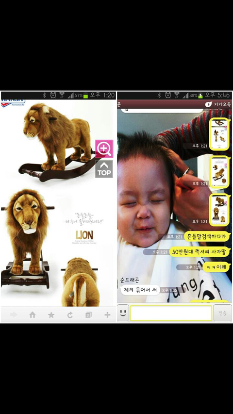 태준이 흔들말 검색후 럭셔리 사자말이 오십만원이나 해서 놀라움을 남편과 공유하니