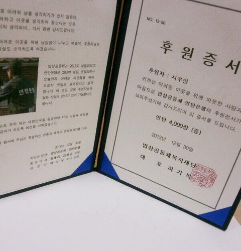 작년 12.25일 크리스마스 서포트 기부로 들어간 기부증서를 지금에서야 받아 인증하게 되었네요^^ 시우민의 이름으로 연탄은행에 연탄 4000장 기부했습니다~! 늦었지만 따수운 겨울, 새해 보내세욧!!!^^)/