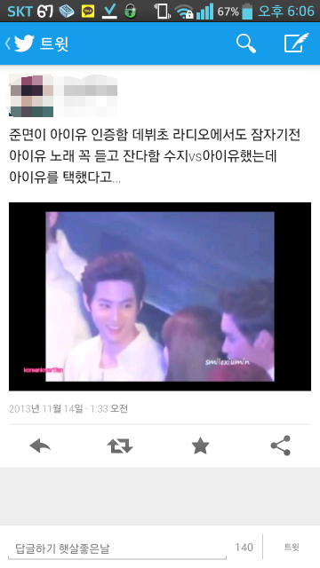 근데 조까 진실성있는말투였음ㅋㅋㅋ 나몰이는 드립이겠지 데뷔초때 라디오에서 아이유 목소리나오는데 수호가 그거듣고 미소미소^.^ 백현이보고 아이유가 불렀다 라고 전하던 애임