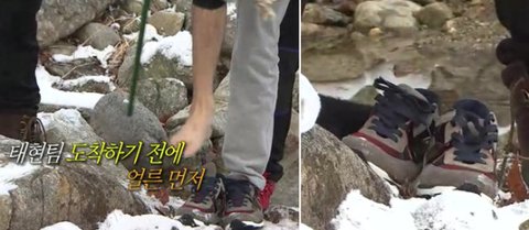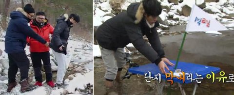 패기 넘치게 얼음 계곡물 속에 들어가는