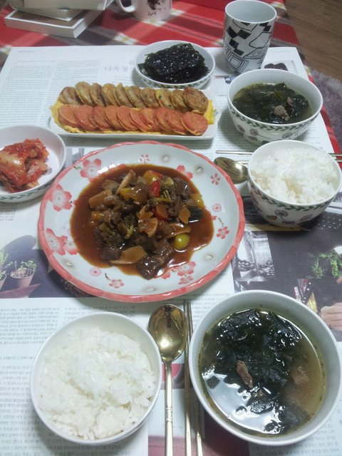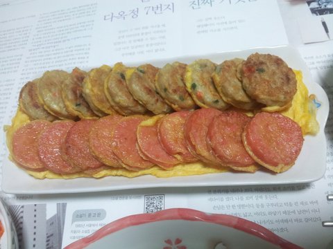 메인메뉴로는 찹스테이크~ 그리고 만만한 동그랑땡이랑 소세지. 저누무 소세지는 맛이 변함이 없음 ^.^ 초딩때 먹던 그 맛임.