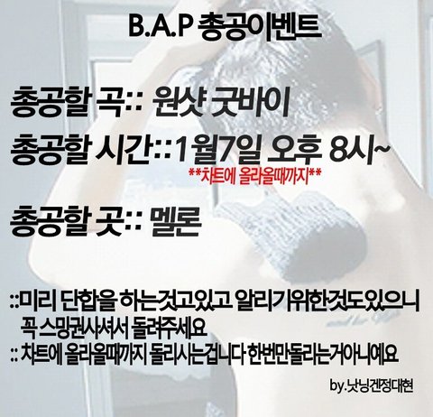 멜론차트에 우리 비에이피 분들의 음악을 순위100위권안에 넣어보는 이벤트를 열어보는것 어떤가요.