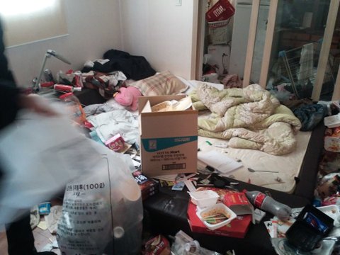 문앞에서 부터 풍기는 악취. . 이게 집인지. .