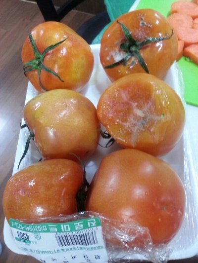 문제의 토마토. 비닐에 포장되어 있어서 안쪽까지 제대로 확인이 불가능하여 살짝씩 눌러보고 그나마 그중에 탱탱한 걸로 사왔습니다. (떨이 제품 절.대.로 아니었습니다.) 근데 비닐을 걷자마자 제 눈에 보인건 역겹기 그지없는 곰팡이, 짓무른건지 썩은건지 거무죽죽한 토마토들 6개.. 4500원 주고 샀습니다.