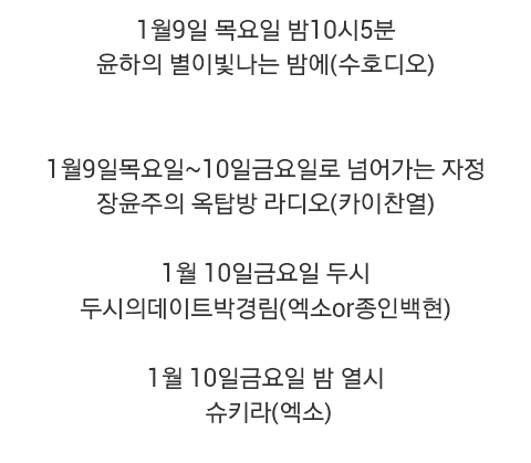 2틀동안챙겨들을거많다 ㅋㅋㅋㅋㅋ♥♥ 슈키라에엑소가게스트라니 ㅠㅠㅠㅠ