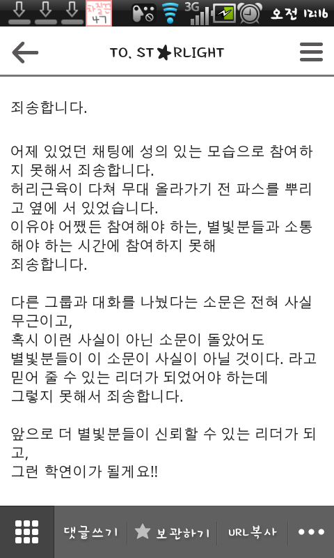 트위터로멘션도막보내시는분들때문에엔오빠뿐만이아니라빅스오빠들다맘많이다치셧을꺼예요ㅠㅠ근데어제엔오빠가공카에다가글을남기셧어요ㅠ허리부상때문데그냥서잇던거고여성가수분들이랑은애기도안하셧다고그러셧어요!진짜이상한루머같은거퍼지는거한순간이지만그애기가어떠한ㄴ영향을끼치는지는다잘알고계실꺼예요ㅠㅠ이상한루머같은거퍼뜨리지마시고빅스한테욕하고빅스탈덕하신분들은제발반성좀해주세요...