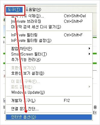 인터넷을 실행후 도구탭을 눌러서 인터넷 옵션으로 들어가주세요.