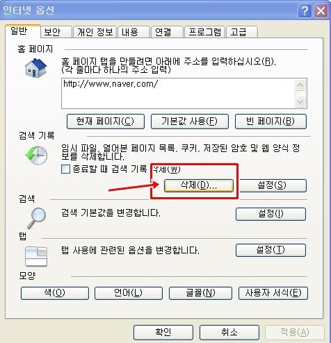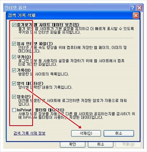 검색기록 삭제부분에 있는 삭제 버튼을 눌러서 삭제할 기록들 옵션을 체크합니다.