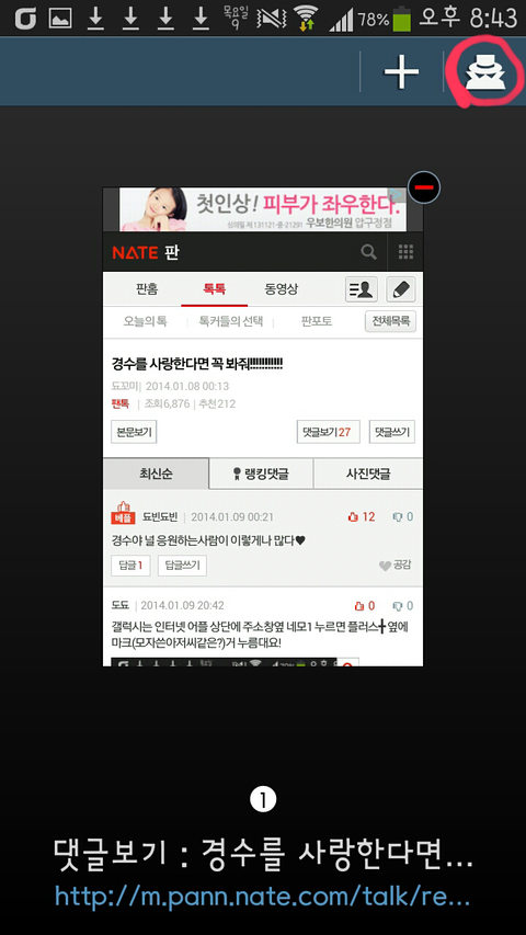 인터넷 어플 상단에 주소창 있지? 옆에 네모1을 눌러
