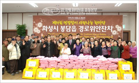 설을 앞둔 1월 21일, 사단법인 국제위러브유운동본부에서 화성시 봉담읍에 홀로 기거하시는 어르신들을 위한 경로위안잔치를 열었다. "경제가 어려워질수록 다들 어렵지만 콩 한쪽도 4등분해서 나누겠다는 나눔의 정신이 더욱 필요하다"는 장길자 회장님의 뜻이 있기도 했거니와, 효의 고장에서 경로위안잔치를 열게 된 것은 사라져가는 효의 정신을 일깨우고, 어려운 형편에 명절이면 외로움까지 더한 어르신들을 살피고 위로하려는 취지에서다. 제14차 '명절맞이 사랑나눔 한마당'의 일환으로 개최한 이 잔치에서 장길자 회장, 이강민 이사장 및 이사진과 회원들은 어르신들의 일일 효자, 효녀들이 되어 명절음식을 대접하고 안마를 해드리며 말벗이 돼 드렸다.