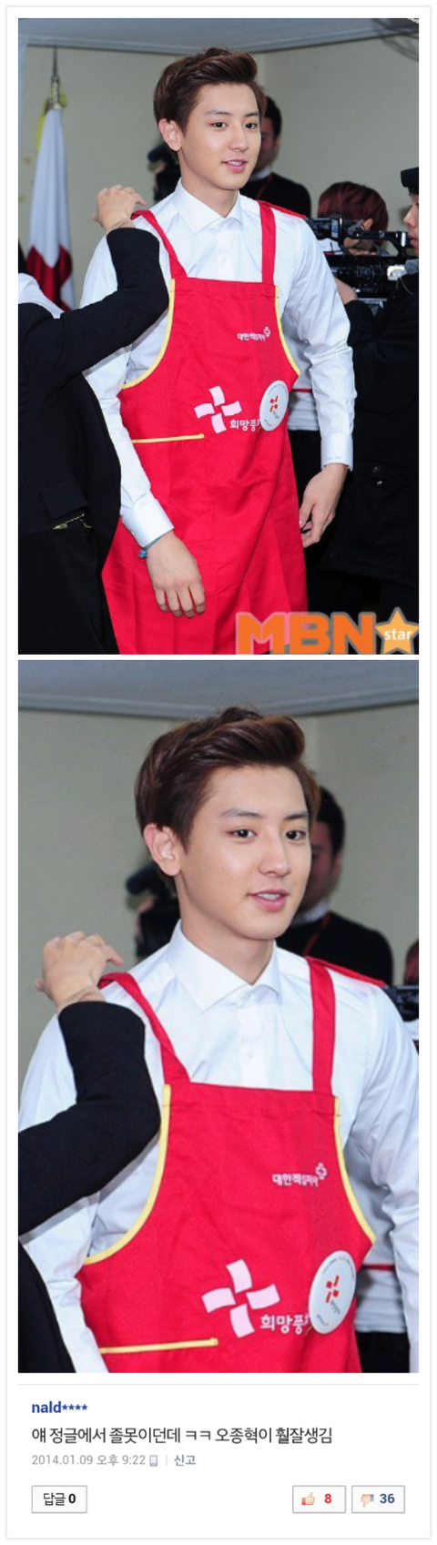 얘들어제 봉사하러갔을때 찬열이 기사사진이 떳는데