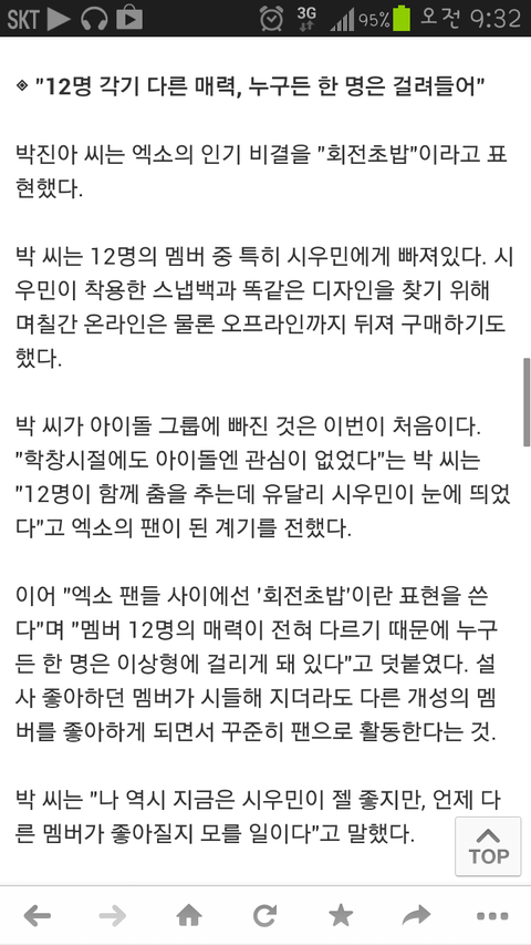 엑소 인기 비결에 대한 기사가 3개 떴는데 그중에서 웅녀 한명이 인터뷰 한거 같아서 가져왔어ㅋㅋ 네이버에 시우민 치니까 나오드라고ㅎㅎ 링크 거는걸 몰라서 이렇게ㅠ