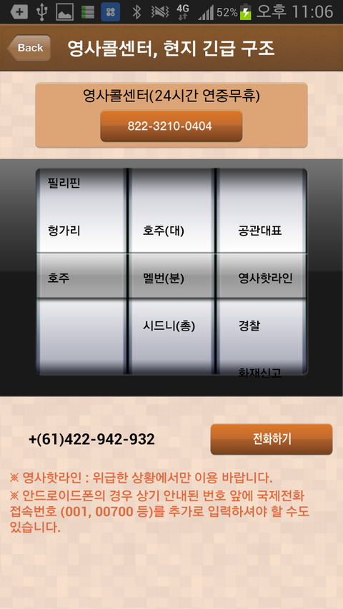긴급하게 전화나 도움이 필요할 때는 영사콜센터를 바로 이용할 수 있도록 어플에 설치가 되어있고요