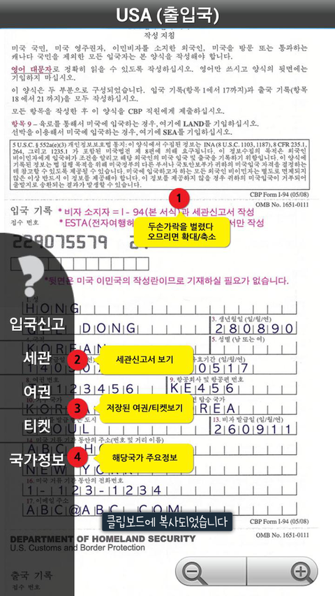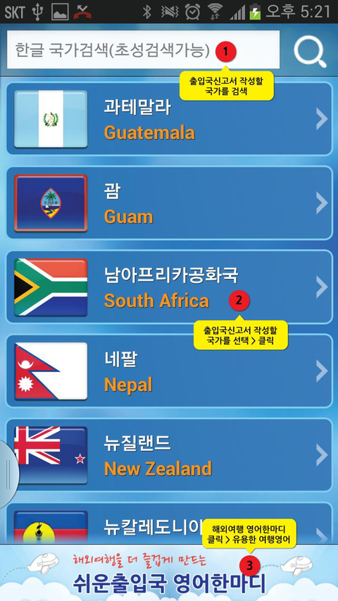 자신이 출입국신고서를 작성할 국가를 선택하고요~
