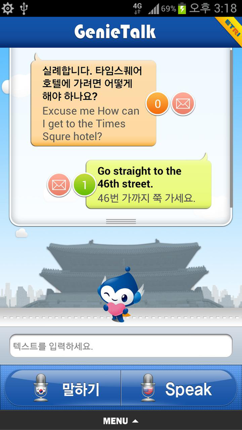 통역이 필요한 문구를 직접 말하거나, 텍스트로 입력하면