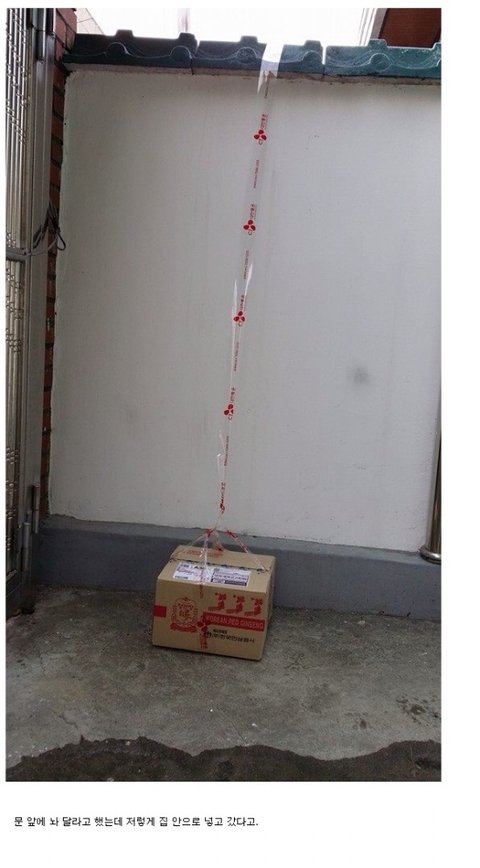 저거 뭔가 던지지않고 테이프 이용해서 줄처럼 천천히 내려놓으려는 택배원님의 작은배려인듯..♡