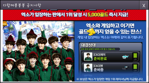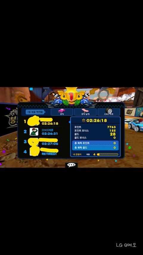 나름재밌다구요 근데그가끔엑소가들어온다고막이벤트창에있는데 제가방금붕붕붕하고있는데 [EXO]세훈 이렇게닉이되있는사람이온거에요!!! 그래서막혼자흥분해갖고 열심히해서1등먹고 그분?(세훈이면진짜좋을..ㅠ)이2등했어요ㅋㅋㅋㅋ