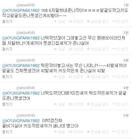 우리 경이........멘션 다 읽어본댓는데....................우리경이.............상처받을텐데..........맨날 웃어도 은근 눈물도 많은앤데....................이건 아니잖아.................왜 직멘을 날려????이건 멤버들한테 성적멘션날린거랑은 다르게 화가난다.........................