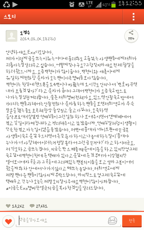 엑소사생팬들진짜이거한번보고다시생각햇으면좋겟다진짜사생짓을서생활침해하는거랑똑같아그리고전화번호알아내서문자전화톡등을하는게말이되?ㅋㅋ진짜엑소도사생활이라는게잇는데이걸침해하면범죄인뎈ㅋㅋㅋㅋㅋ사생들이지금이짓을하고잇냌ㅋㅋㅋㅋㅋㅋ진짜힘들어하는거알면서도하면인간도아니다?ㅋㅋㅋㅋ진짜이러다가막말로엑소가헤체하면어떻할랰ㅋㅋㅋㅋㅋ위에사진도봐얼마나힘들면오리겟어사칭이든머든맛는말이야ㅋㅋㅋㅋㅋㅋ도경수가왠만하면신경안쓴느데이건정도를너무지나첫잔아엑소도방송에서이렇게웃고잇는데얼마나힘들겟어그리고백현이햔드폰을한달에열몇번을바꿧는대그번호를다알아내서폰바꾸자마자하는짓이머?ㅋㅋㅋㅋㅋㅋㅋㅋ톡을로번호바꾸면내가모를줄알엇어?이랫니..?ㅋㅋㅋㅋㅋ진짜에바야이글재발사생들이보고그만햇으면좋겟다카스에박찬열,도경수,오세훈,등이글올렷어힘들다고사생때문에그러니깐그글을한번이라도더보고다시생각햇으면좋겟다