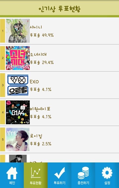 마켓에서 케이팝어워드친다음에 첫번째에뜨는거다운받고 투표. 트위터하는사람은 트위터같은곳에좀알려주세요 완전밀리고있어요 투표한사람들중뽑아서 가온차트케이팝어워드초대권도준대요. 다른곳에도많이알려주세요.