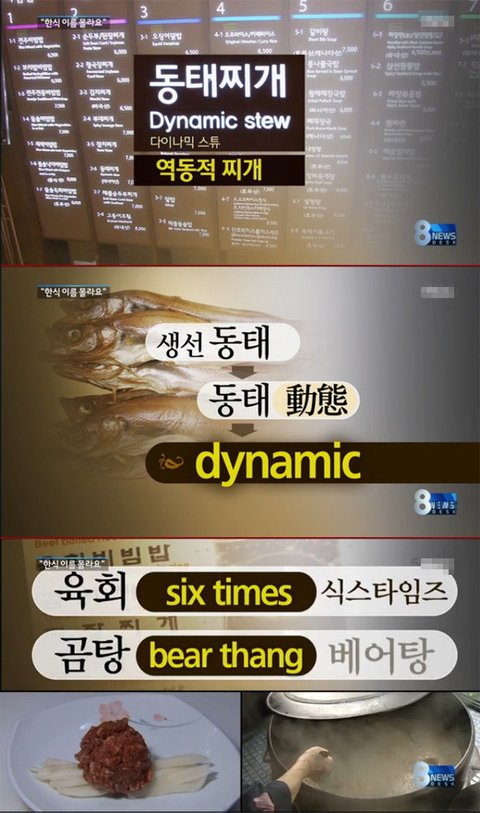 그냥.... 이름대로 영어표기하면되자녀;; gomtang 뭐 이런식으로-_- 그럼 스테이크도 걍 고기덩어리구이 이렇게해놓지 왜 한글로 스테이크라 쓰냐 -_- 재미로 저래놨어도 문제다 우리나라 음식문화인데 장난질이여-_-