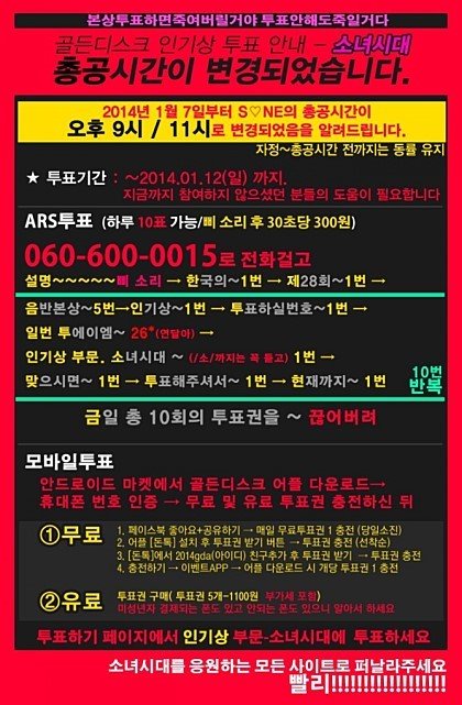 소녀시대팬소원입니다. 진심으로부탁드릴게요. 현재진행중인골든디스크어워즈 인기상부분 투표율 에서소녀시대가 2위를달리고잇습니다. 1위는샤이니분들이구요. 그런데샤이니팬분들은 걸스데이팬분들과 단합하여 표를끌고잇답니다. 저희소원도 여러곳에부탁드렷지만 돌아오는건 없 엇어요마지막희망걸고 부탁드릴게여