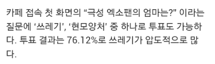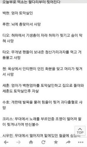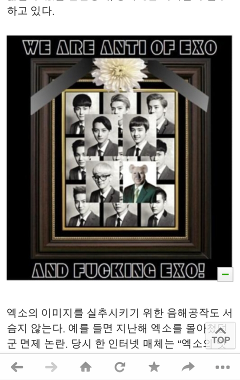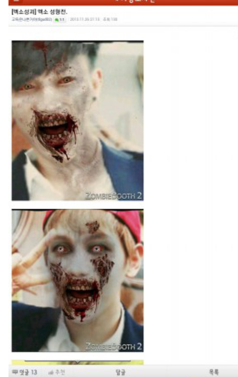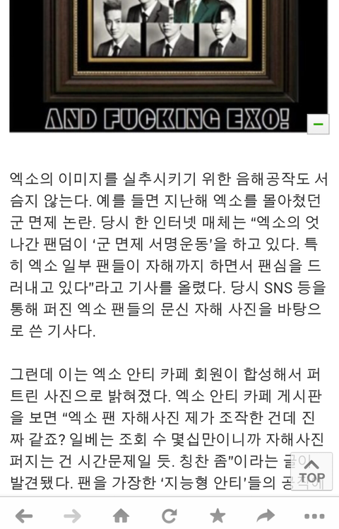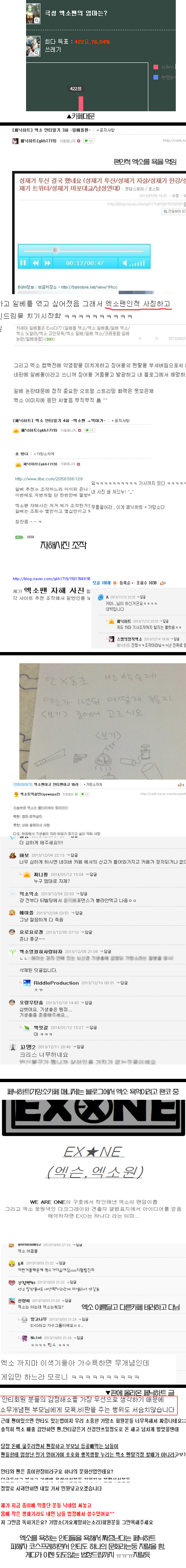 마지막으로 판에 엑소얘기로 도배해놨던점 사과드립니다 지금은 톡선에 글 안오르게하려고 팬톡에쓰고 있고요 요즘은 글 많이 없습니다 그리고 무개념엑퀴란소리 안듣게 하려고 많이 노력하고있습니다 이건 누가봐도 도가 지나친 행동인데 댓글을 읽어보니까 이게 잘못된 행동인지 모르는 분들이 몇분 계시더라고요 멀쩡히 살아있는 사람들 얼굴을 피투성이로 만들고 사지가 절단되느니 어디에 찔려 죽는다느니 이런얘기를 하는게 정상입니까? 아무리 싫어도 선을 넘으면 안되죠 그리고 타아이돌에 비해 엑소가 욕을 더 많이 먹는건 사실입니다 그게 다 저희 팬덤때문에 생긴일이기때문에 사과드리고요 이제 많이 바뀌려고 노력하고있으니까 엑소 조금만 더 좋은 시선으로 봐주셨으면 좋겠습니다ㅠㅠ 엑소는 정작 아무것도 안했는데 욕먹는거보면 팬입장으로 되게 슬퍼요ㅜㅜ글 읽어주셔서 감사하고 앞으로는 이런 일 안일어났으면 좋겟네요..