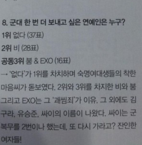 어딜가나 따라다니는 엑소 군면제ㅋㅋㅋㅋ댓글 보면 엑소는 군대나가라 라는 말이 많음 그리고 어떤 설문조사에선 심지어 이거나옴