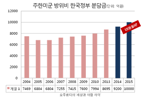 정부는 주한미군 방위비분담금 협상이 타결됐다며 올해 한국정부가 부담해야 할 분담금이 9200억원에 이른다고 발표했다. 이는 7차 협상 때인 2009년 보다 1600억원, 작년보다 505억원이나 증가한 수치다.