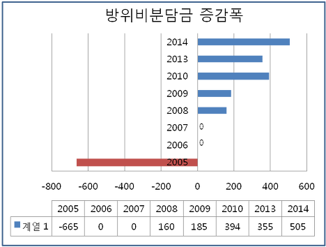 SMA가 시작된 1991년부터 지금까지 방위비분담금은 1073억원에서 8695억원(2013년)으로 8.1배나 증가했다. 반면 정부의 국방비는 4.6배 증가하는 데 그쳤다.