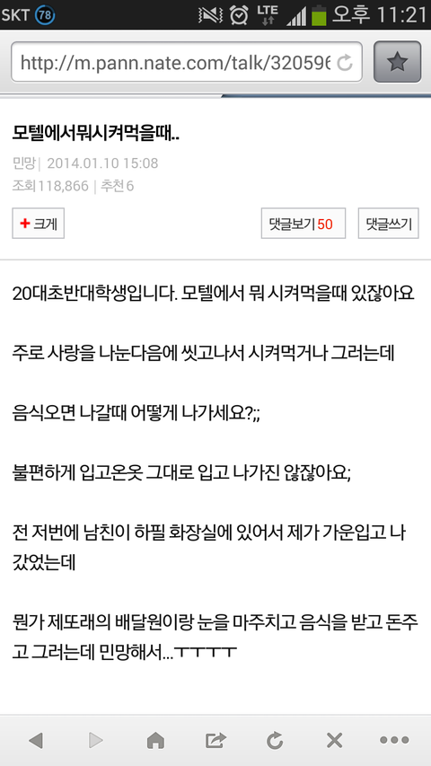 제가 대학 방학이라서 배달알바하구있어여 근데 모텔에 배달갔었는데 어떤 여자분이 가운입고 나와서 음식을 받는거임... 남자는 화장실에서 똥싸꼬있는것 같구 님은 부끄러웠져?저는 그순간을 어찌해야 될줄몰랐어여 눈 마주치는순간 아 ㅅㅂ 조카 민망하네 빨리주고 나가야지 이런생각 밖에 안들었어여 ㅋㅋ 님 사시는곳이 경기도 구리이면 저 맞을거에여 ㅋㅋ