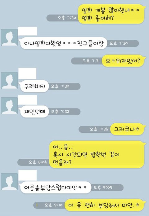 첫번째같은경우는 저렇게 그냥 솔직하게 답해주는편이 더 편하지않나??ㅋㅋㅋ빙빙돌리고 핑계대고 불편해지는것보다...뭐..기분나쁘게말하는것두아니니깐 ..아님말구 ㅋㅋ
