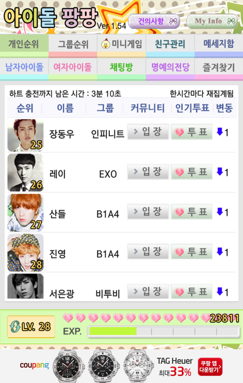 아이돌팡팡이라고 가수순위 투표하는 앱인데 다운받아서 레이순위좀 올려줘요 순위가 넘 낮아요 !!