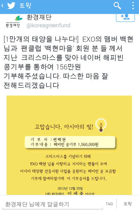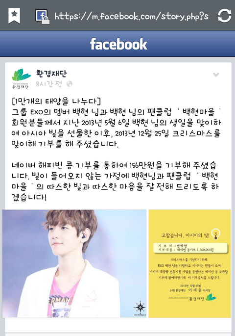 뿌듯뿌듯저번에올린거지만트위터랑페이스북은오늘떳어!!ㅋㅋㅋㅋ벌써크리스마스서폿백현이이름으로만3곳기부!!백현이가알았음좋겠다