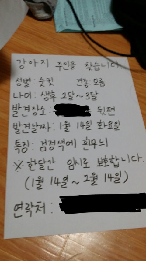 친구와 함께 강아지주인을 찾는 전단을 적어 발견된곳 주위와 동네에 붙였습니다.