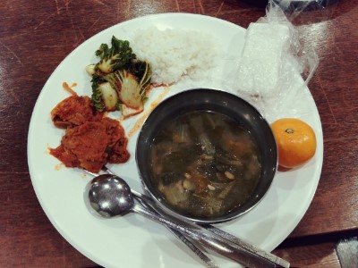 돼지고기 김치두루치기 / 겉절이 / 흰쌀밥 / 들깨 시락국 / 꿀 백설기 / 귤