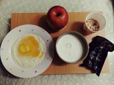 달걀 후라이(no기름) / 사과 / 우유 / 바이오젠트랄 굿모닝 무슬리 / 콩콩볼 블랙 미니 1팩