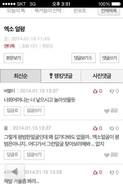 여자 아이돌 얼굴 평가하는 글에 저게 안이쁘면 뭐가 이쁜거임?이런 댓글들 있으면 대댓글에 이뻐보이는것도 개취인데 왜 예쁘다고 세뇌당해야함?이런 반응들이 수두룩했음. 그래서 난 과연?남자 아이돌 외모 평가에 대한 글을 올리면 어떤 반응이 일까해서 실험해봤음.