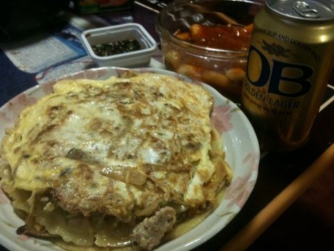 부산 서동에서만 파는 거에요~ 밀가루물 얇게 펴서 위에 당면야채조금 올리고 계란 올려서 부치는거 ㅋㅋㅋ 떡볶이 국물이나 간장 올려서 먹는거에여 ㅋㅋㅋ 맛있음 그냥 계란후라이맛 아님!
