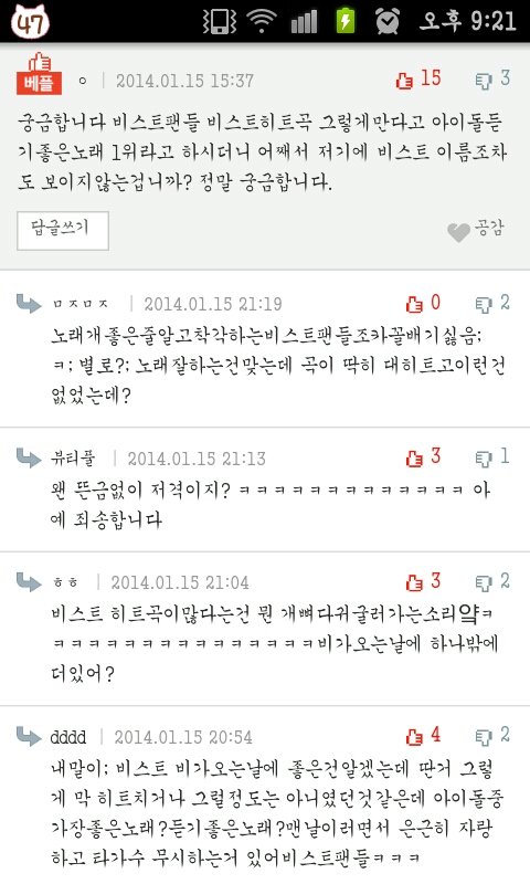 어이없음 ㅋㅋㅋㅋㅋㅋㅋㅋㅋ 대댓글도 ;타가수 언제 무시했다고? 글에 비스트도 안보이는데 왜 뜬금없이 저격질이지?