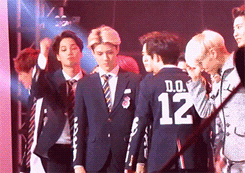 디오가 가운데 있는거 불편하다나?그래서 끝쪽으로 갈려고 했는데 카이가 디오 가운데 세우려고 막았다했다했음 그러면서 사람들도 다 막 디오귀엽다 이랬는데