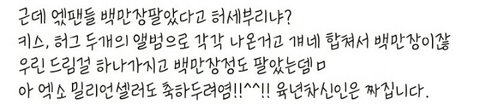 욕먹을까봐 근데 그런거 가만하고 카스를 들어가봤다.저 글을 쓴 사람은 샤월이야(글쓴은 샤월엑소팬)엑소가 20도로 인사하는거 진짜 잘못한거 인정해 근데 너무 화나는게 앨범100장이 누집 개이름이야?드림걸 100만장 팔았으면 뉴스가 뜰텐데 그리고 지능형 안티가 쓴글 가지고 엑소 깎아내리는건 또 뭐야? 저렇게 깎아 내려야됬나?난 샤월이 맨달 달고다니는게 천샤월 이였는데 아닌가보다