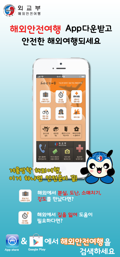 - 여행 출발 시 외교부 “해외안전여행” 어플리케이션을 다운받아 해외여행 관련 각종 정보를 활용하시기 바랍니다.