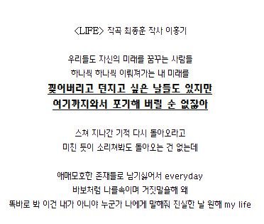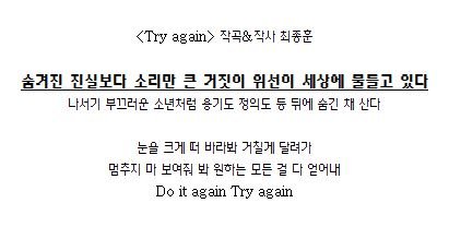 이러한 FTISLAND 의 밴드다운 면모 알아주셨으면 좋겠고 보고 느끼신 점,곡의 가사에서 발전한 모습이 보이는지 혹은 아직 미숙하다고 느껴졌다면 어떤 점이 별로인지 이유없는 무조건의 비난보다는 정당한 비판의 댓글을 남겨주셨으면 합니다! 저희 또한 이유없는 비난이라고 생각되는 댓글 이외의 평과 비판의 말에는 아무런 태클 걸지 않겠습니다. 읽어주셔서 감사하고, 앞으로의 FTISLAND의 모습도 많이 지켜봐주세요!! 그럼 모두 굿밤되세요